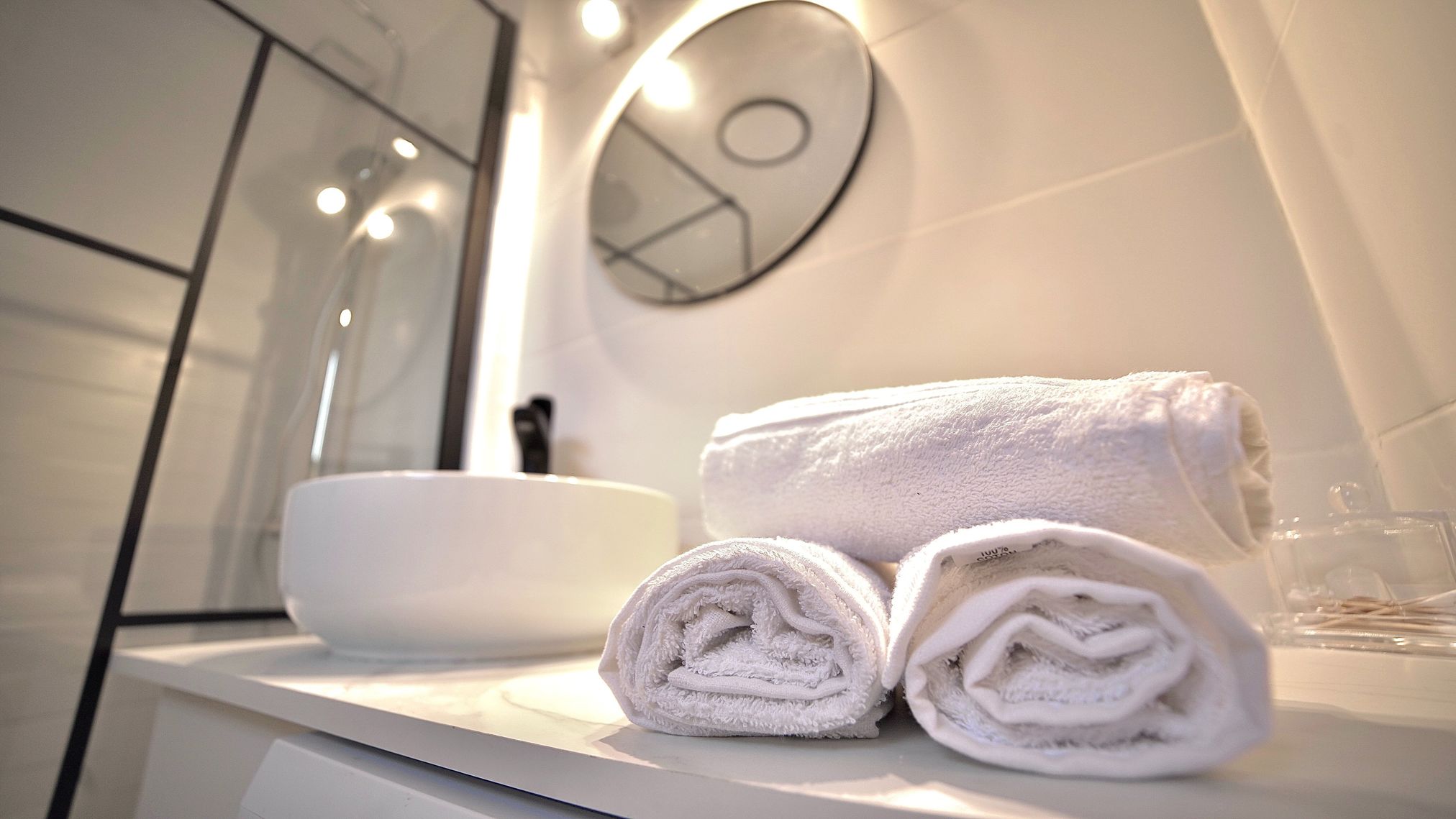 Una entrada privada conduce a los huéspedes al piso, donde podrán disfrutar de vino o champán y bombones o galletas.