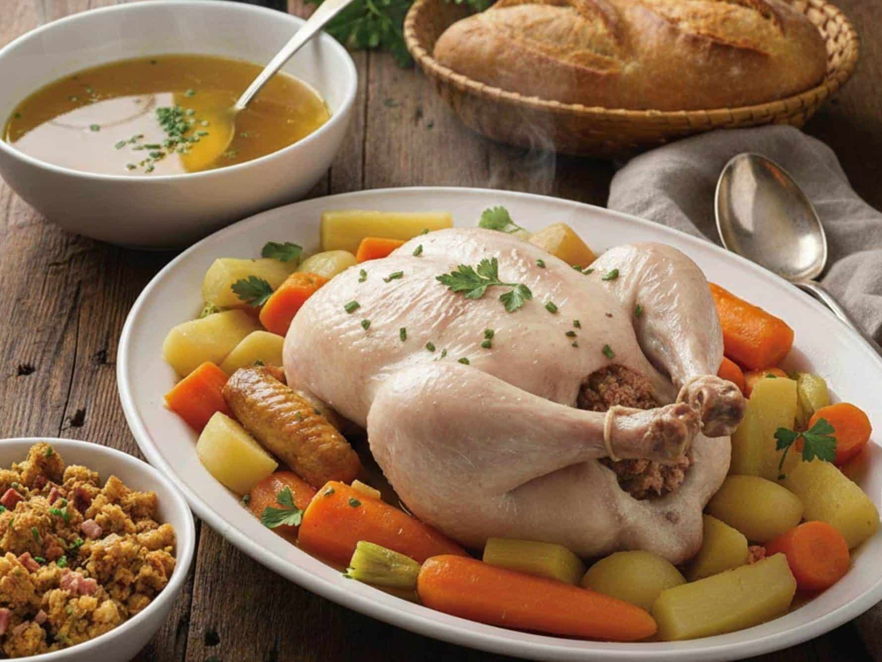6. Servir : proposez le bouillon en entrée, puis la poule découpée accompagnée de ses légumes.