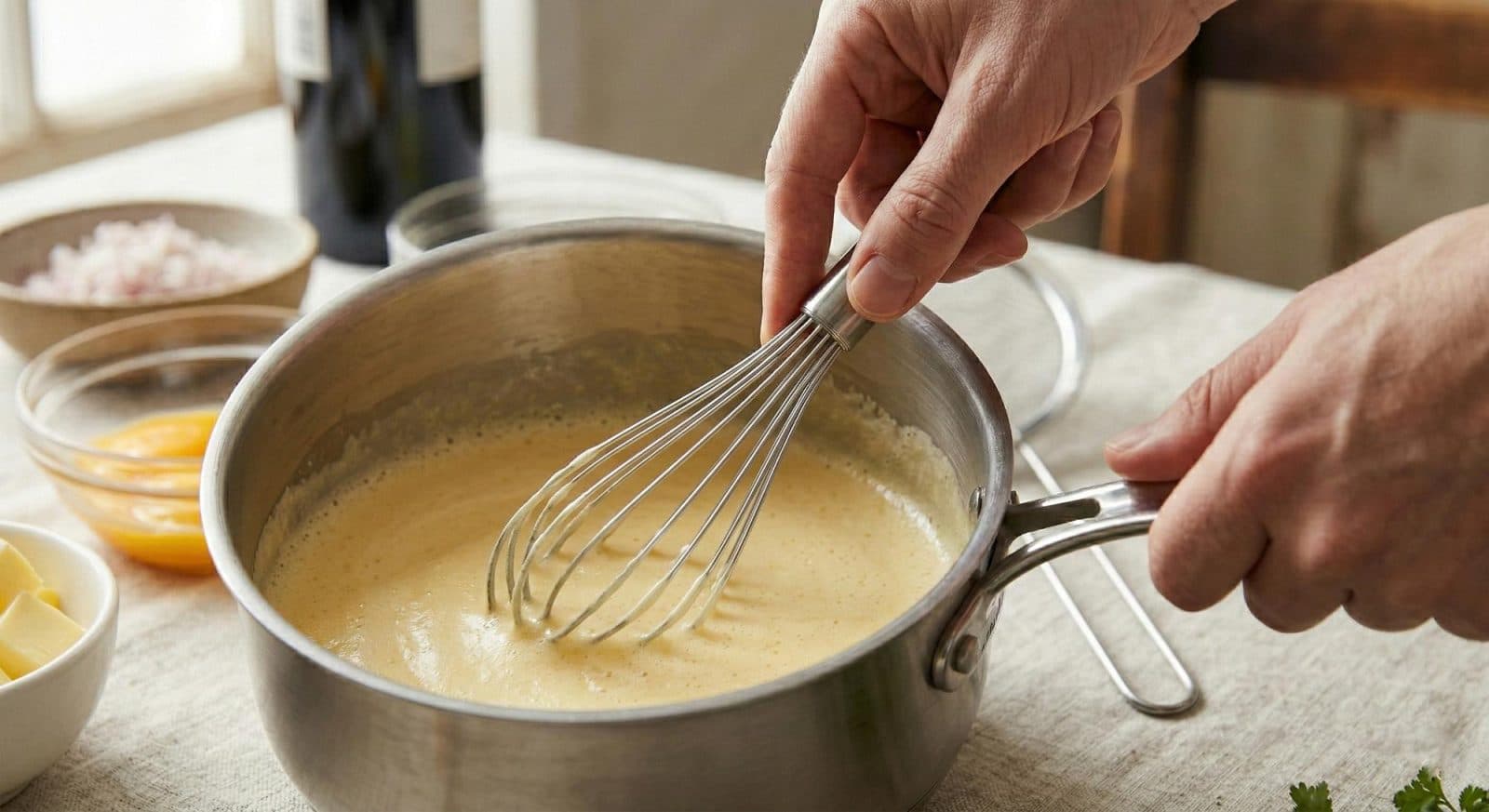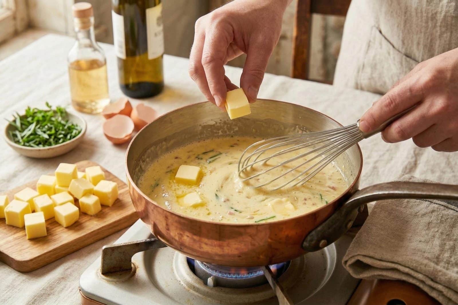 - L’émulsion : Une fois que les œufs ont la consistance d’une crème légère, incorporez le beurre petit à petit, dé par dé, sans cesser de fouetter. La sauce va épaissir et devenir brillante, comme une mayonnaise. Continuez jusqu’à incorporation totale du beurre.