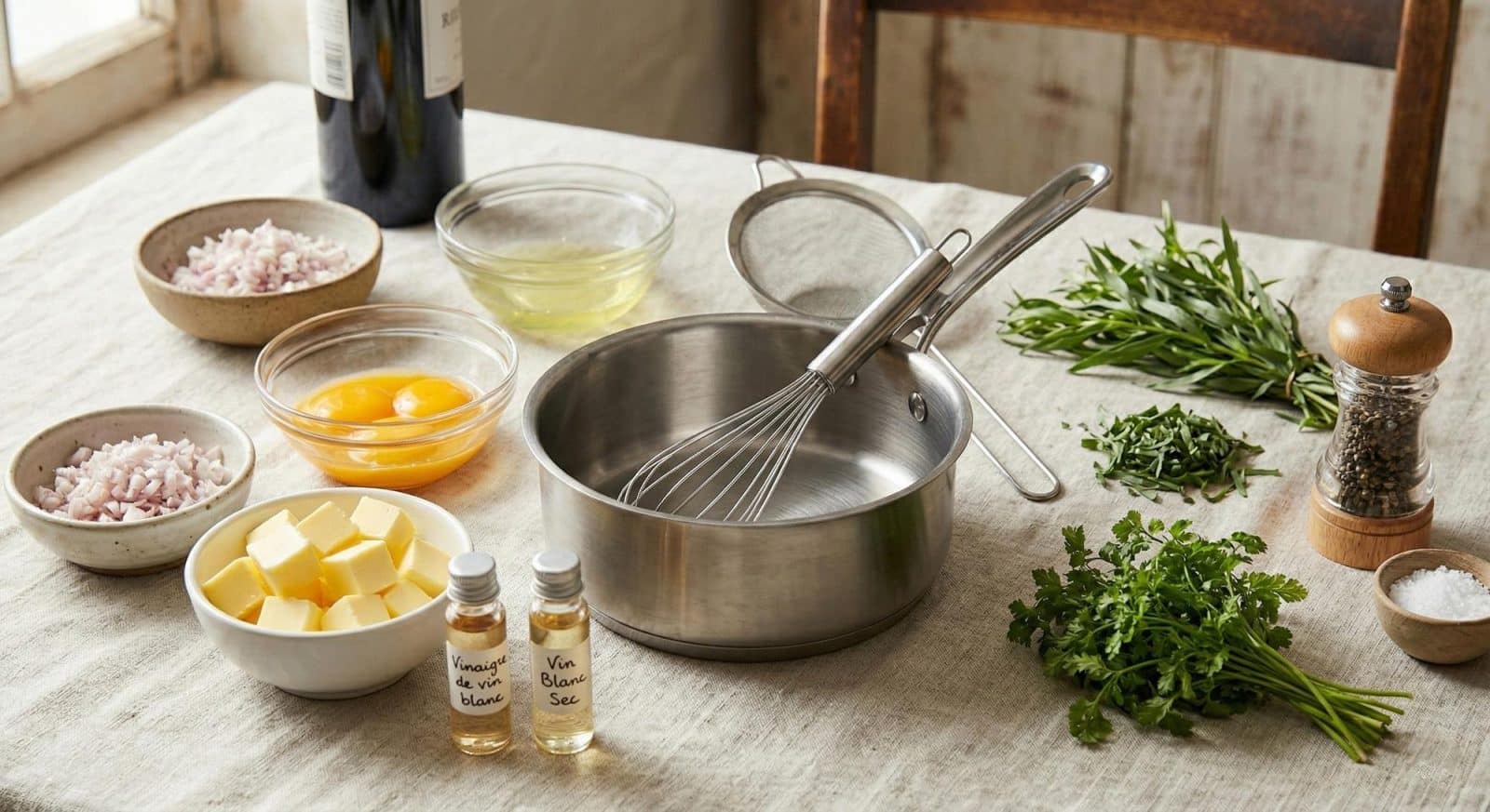 - Préparez les légumes : La réduction : Ciselez finement les échalotes. Hachez grossièrement les queues de l’estragon (gardez les feuilles pour la fin). Dans une casserole à fond épais, mettez les échalotes, les queues d’estragon, le vinaigre, le vin blanc et le poivre concassé. Faites chauffer à feu moyen jusqu’à ce que le liquide s’évapore presque entièrement. Il doit rester l’équivalent d’une cuillère à soupe de liquide sirupeux. Laissez tiédir hors du feu.