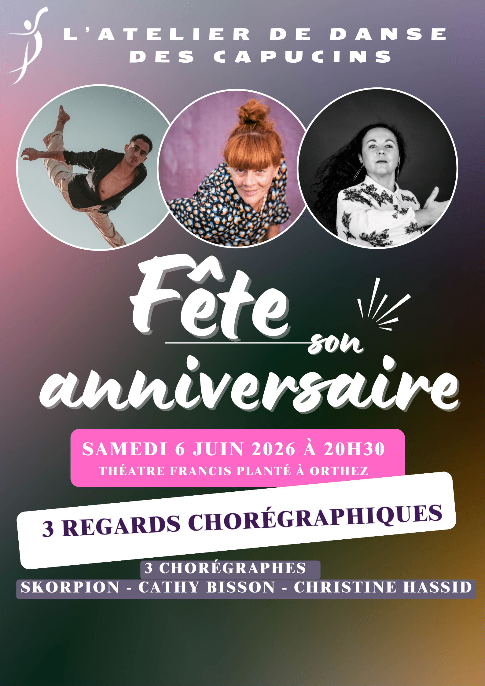 À l’occasion de son anniversaire, l’Atelier de danse des Capucins d’Orthez (et sa directrice aux commandes depuis 20 ans) décide de célébrer une aventure humaine et artistique unique, à travers 3 spectacles de fin d’année.