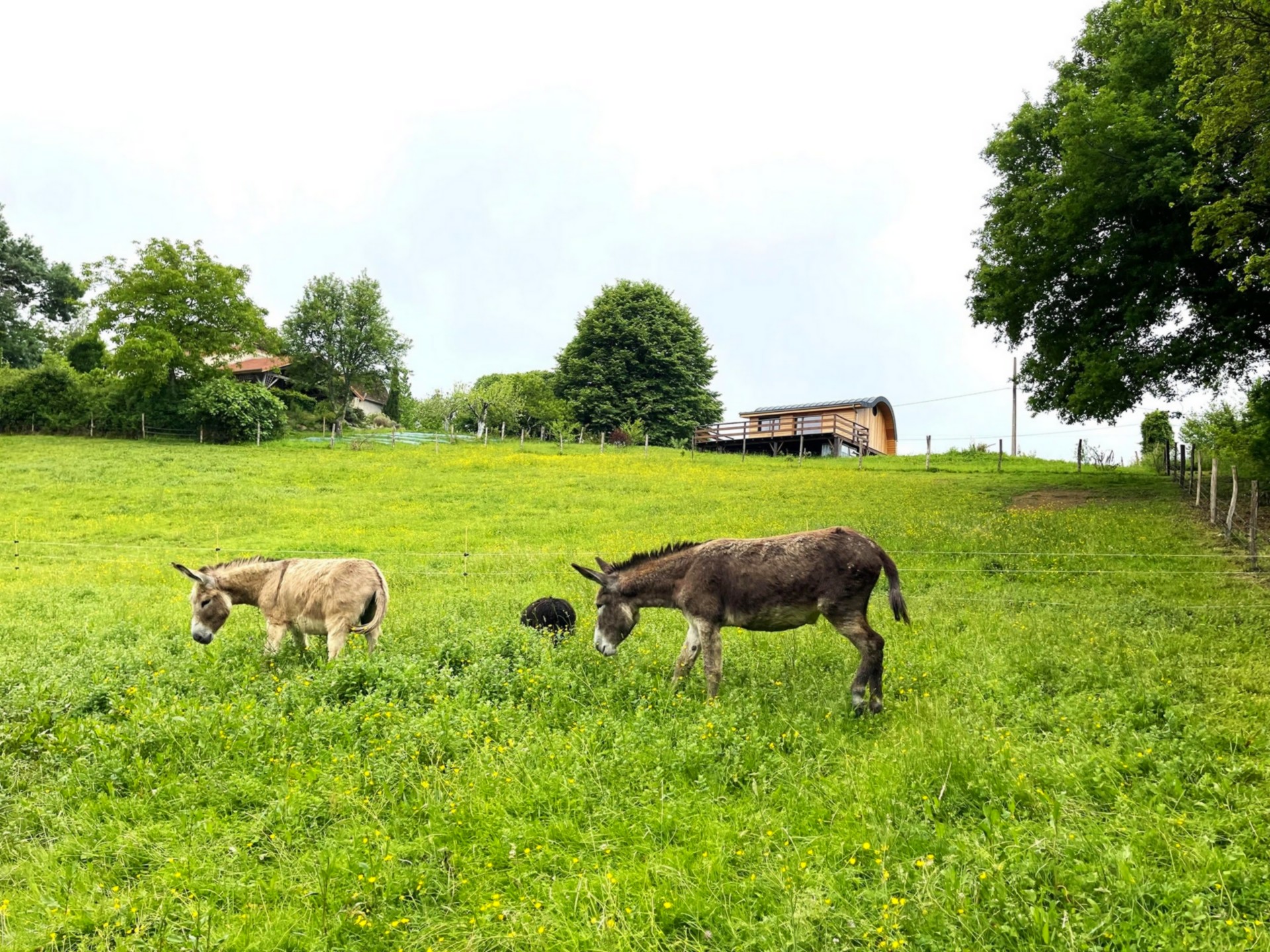 Face à vous, sur une grande terrasse, profitez d'un tableau vivant et apaisant. On y aperçoit des champs, de grands arbres et en contrebas des ânes et moutons. On entend le chant des oiseaux, le souffle du vent dans les arbres et parfois les grenouilles de la mare.