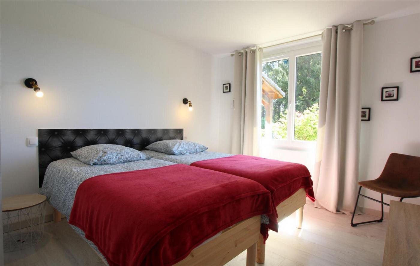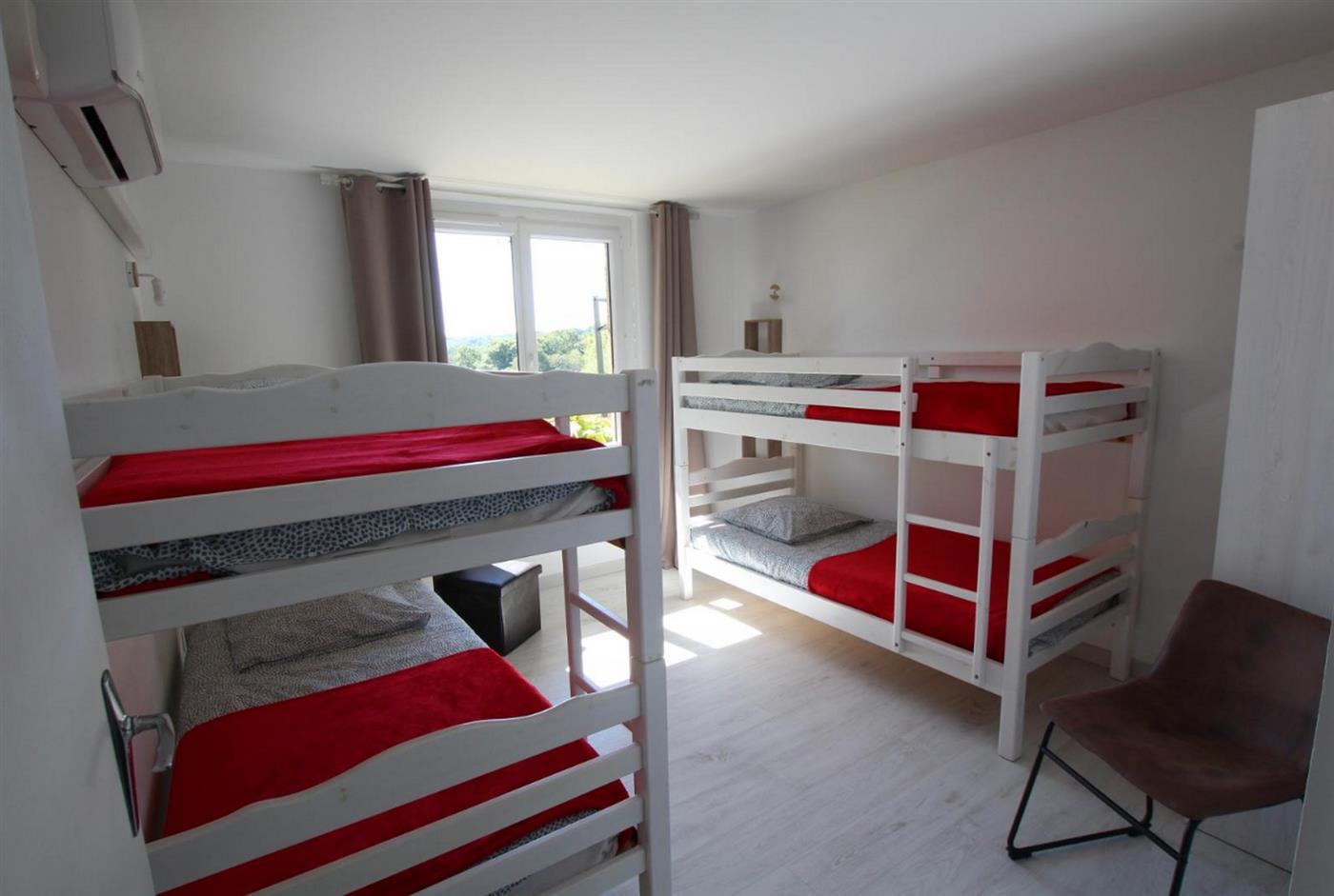 2 chambres (4 lits 90 dont 2 superposés. 1 lit 180 séparable en 2 lits 90). 1 lit bébé et chaise haute.
