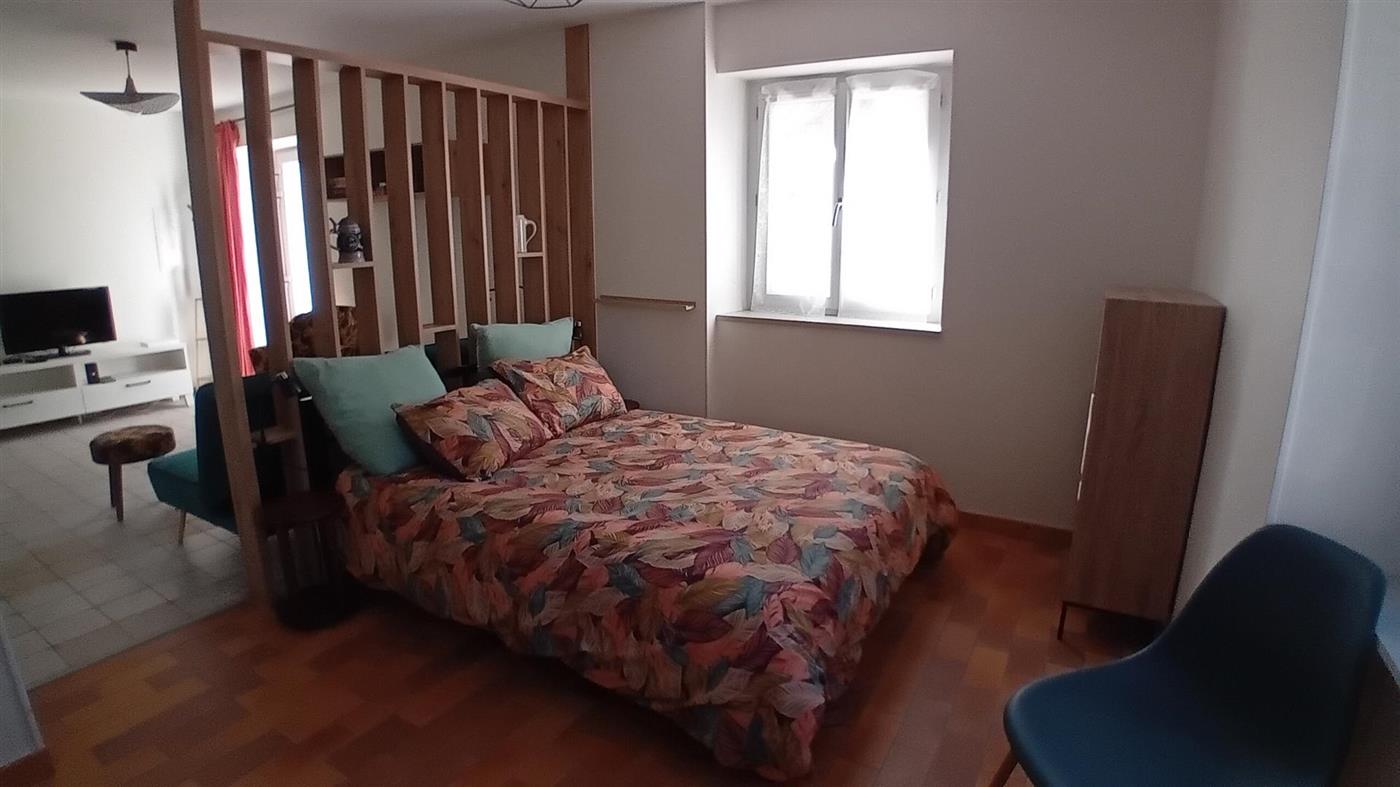 Le gîte propose une pièce de vie spacieuse et lumineuse, orientée plein ouest. La rénovation récente a privilégié une isolation performante, garantissant une fraîcheur naturelle très appréciable durant l'été. La décoration, à la fois sobre et soignée, s'accorde avec un équipement moderne et complet. Vous disposez d'un espace nuit confortable, séparé visuellement par une élégante cloison en bois ajouré. Le coin salon, équipé d'une télévision et de mobilier design, prolonge une cuisine ouverte fonctionnelle. À l'extérieur, un grand jardin privatif avec mobilier vous permet de profiter pleinement de la nature environnante. Un chêne majestueux y déploie son ombre pour vos moments de lecture ou de repos.