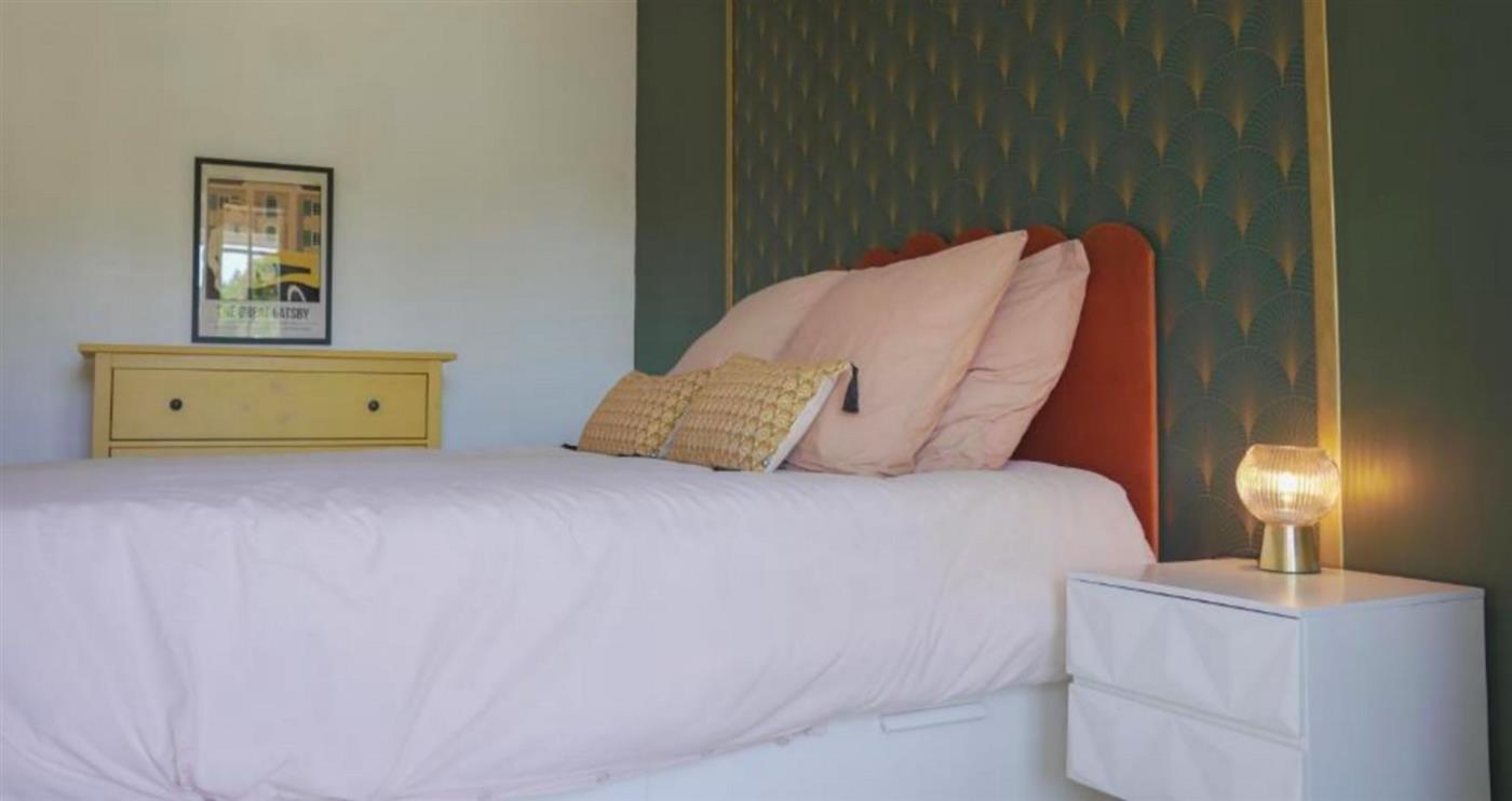 Une chambre élégante au style Art Déco avec lit double.