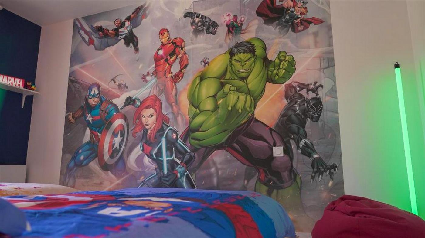 Une chambre super-héros avec lit simple, lit gigogne et mur Marvel XXL.