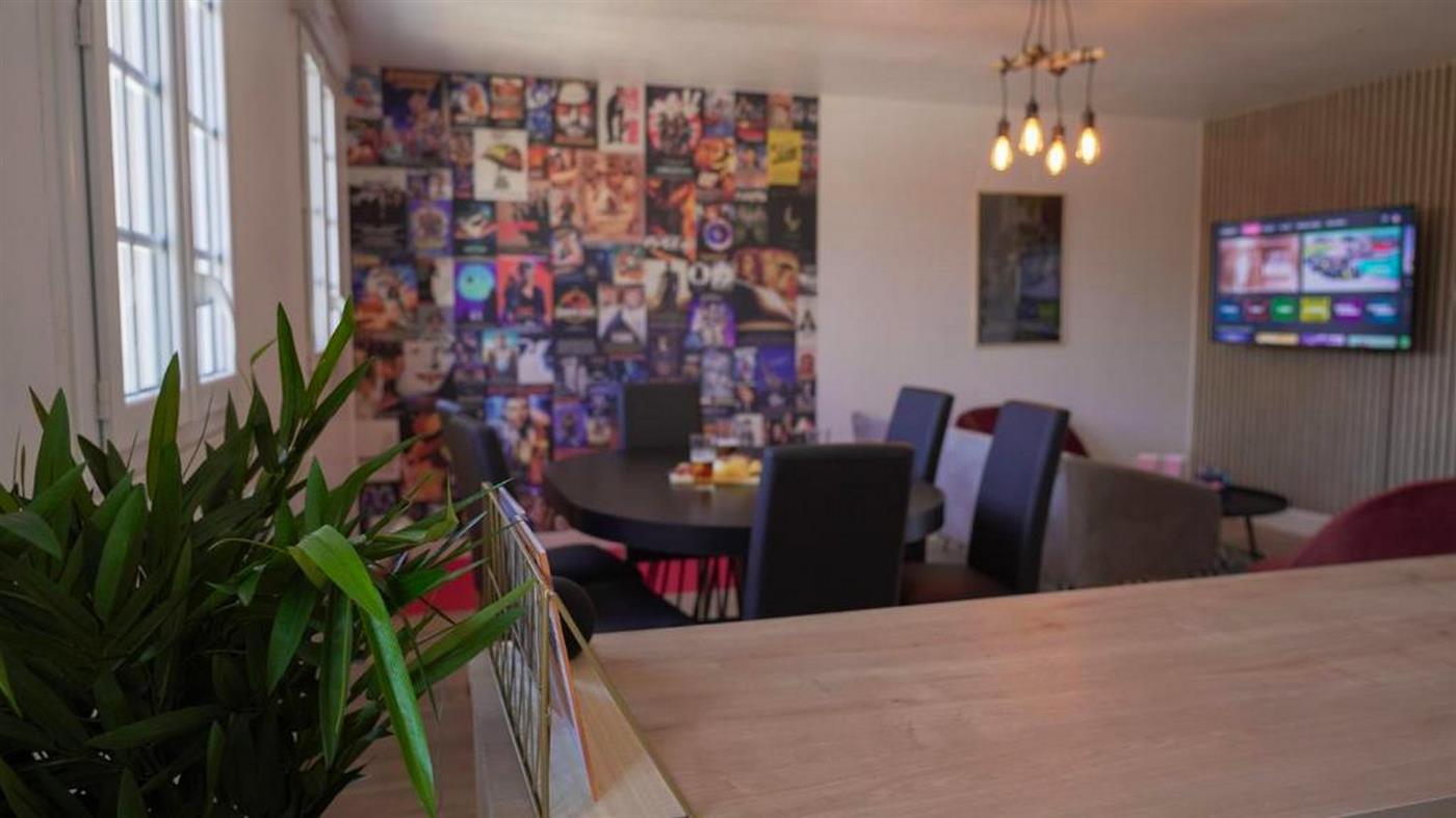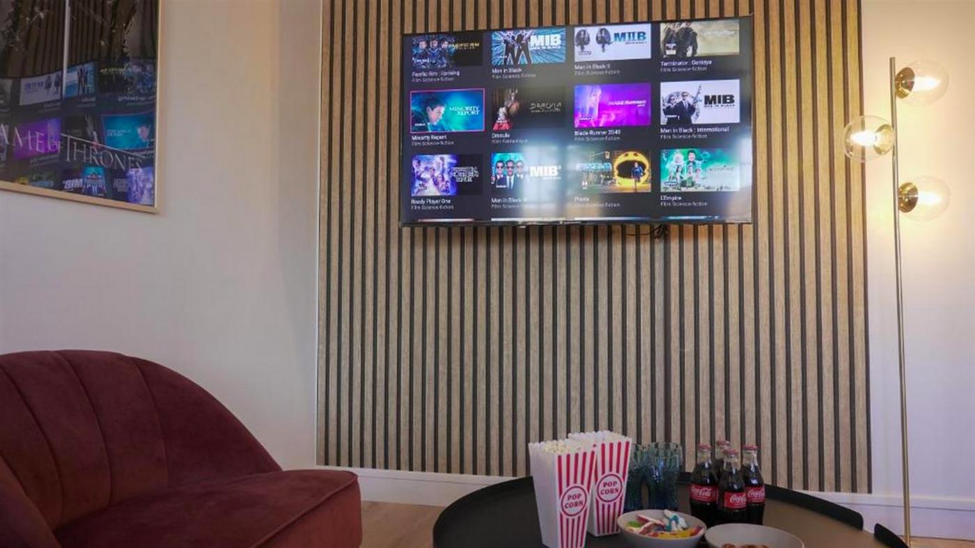 Entièrement imaginé et décoré par le propriétaire passionné de cinéma, l’appartement propose une véritable expérience immersive. Chaque pièce possède son propre décor, inspiré des grandes œuvres du 7ᵉ art : affiches cultes, touches design, ambiance feutrée… Tout a été pensé pour que vous plongiez aussitôt dans un univers cinématographique élégant et confortable : le charme vintage d’un film en noir et blanc, l’énergie d’un blockbuster, ou la douceur d’une comédie romantique.