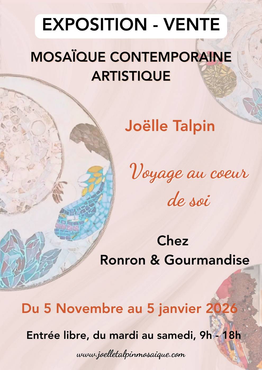 "Voyage au coeur de soi", c'est notamment un parcours à travers plusieurs de ses mosaïques, de forme ronde, qui explore les grandes étapes, des révélations qui lui sont apparues depuis le devenir mère jusqu'à maintenant. Une exploration intérieure profonde, qui fait écho à chacun et chacune.