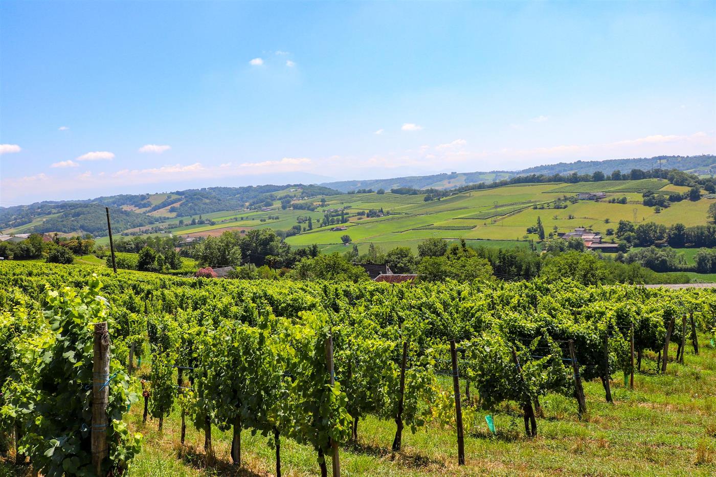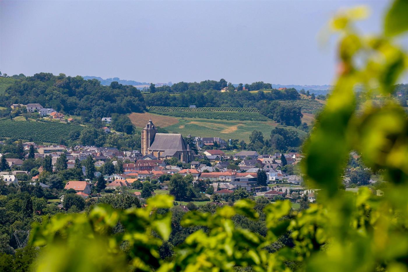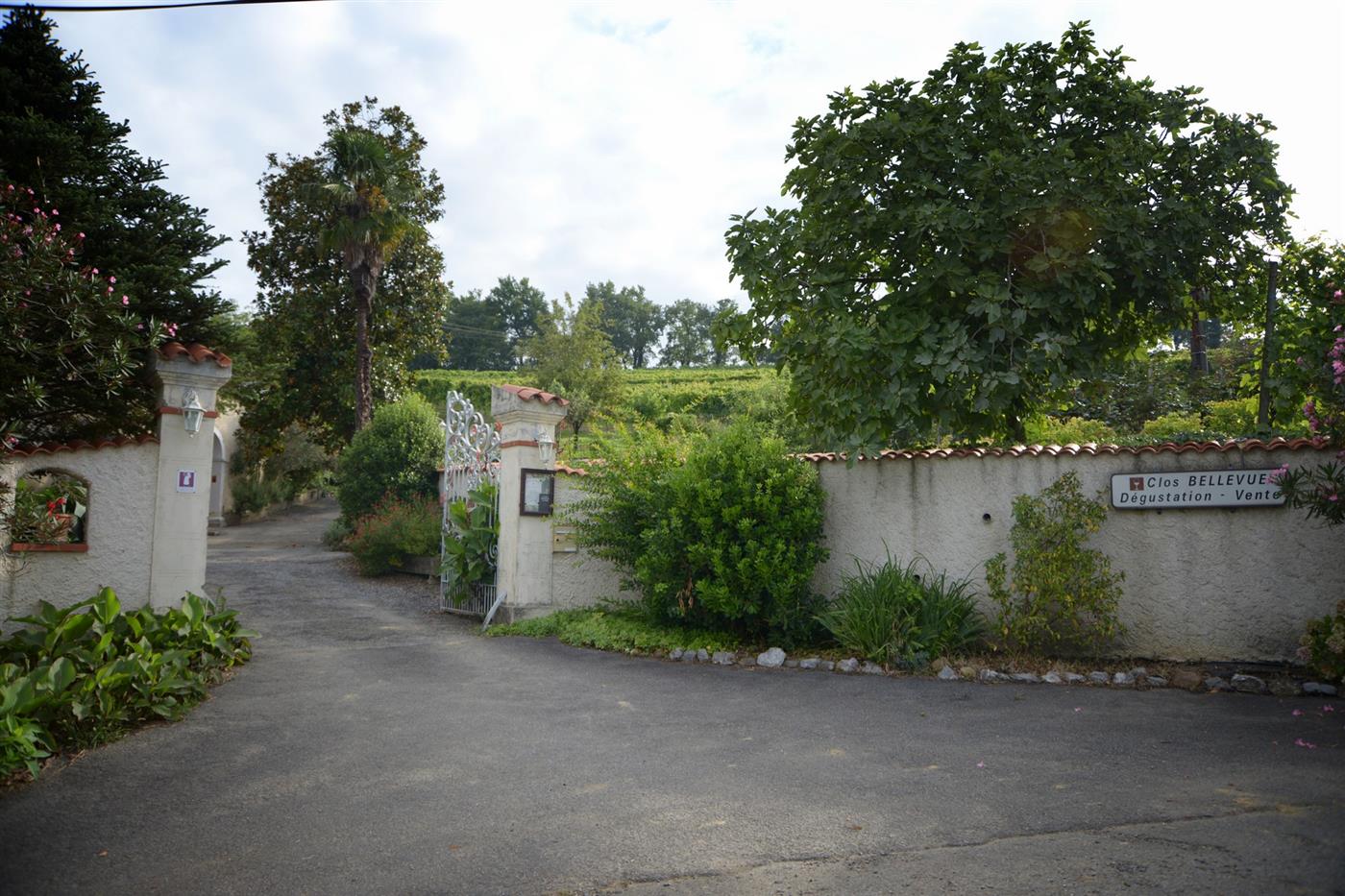 Le Clos Bellevue se dresse sur les coteaux de Cuqueron, à trois kilomètres de Monein. Cette propriété historique, bâtie en galets apparents, appartient à la famille Muchada depuis 1789. Aujourd'hui, les frères Olivier et Romain perpétuent l'héritage familial sur ce domaine labellisé "Destination Vignoble". L'exploitation associe viticulture en AOC Jurançon et élevage, face à un panorama exceptionnel sur la chaîne des Pyrénées.