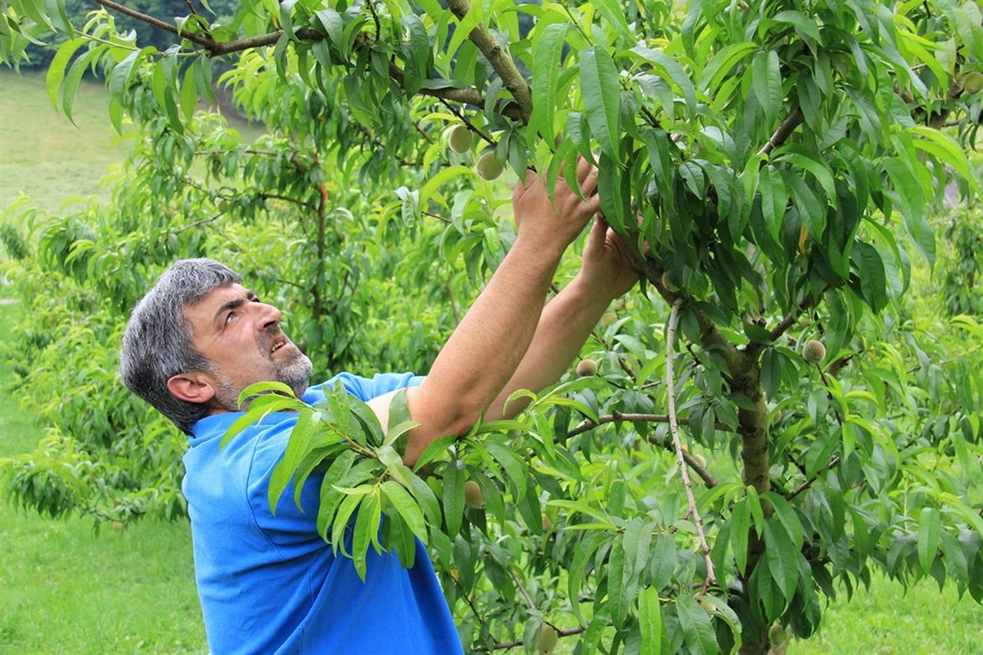À Monein, Robert cultive la pêche Roussanne, une variété typiquement béarnaise. Cultivée depuis le Moyen-âge, elle pousse sur des sols caillouteux au cœur du vignoble du Jurançon. Il vous accueille dans son verger de 600 arbres où il cultive deux variétés, la Campanulée, qui est récoltée de façon précoce, et la Rosacée, récoltée plus tardivement. Robert vous présente son verger, où il vous dévoile les secrets de la culture de la Roussanne : l'entretien du terrain, la taille des arbres, et les techniques de récolte. C'est l'occasion unique d'apprendre l'histoire de cette pêche emblématique et de comprendre les exigences de l'agriculture raisonnée sans pesticide, sans désherbant et sans engrais de synthèse.