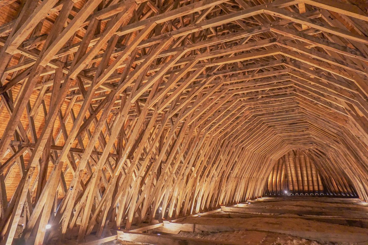 En empruntant la tour clocher et aprés avoir gravi 72 marches, vous découvrez la charpente de l'église St Girons. Sa forme exceptionnelle évoque une double coque de navire renversé, suspendue au-dessus des voûtes. Elle s’étend sur 50 m de long, 20 m de large et 18 m de hauteur, offrant une impression de grandeur et de légèreté à la fois. Pour la construire, il a fallu plus de 1 000 arbres, exclusivement du cœur de chêne, soigneusement sélectionné pour sa solidité et sa longévité. Chaque poutre témoigne du savoir-faire des artisans du XVe siècle, capables de transformer le bois en une structure aussi imposante que raffinée. Admirer cette charpente, c’est contempler un mariage parfait entre art, technique et nature, qui reste l’un des joyaux les plus remarquables de l’église.